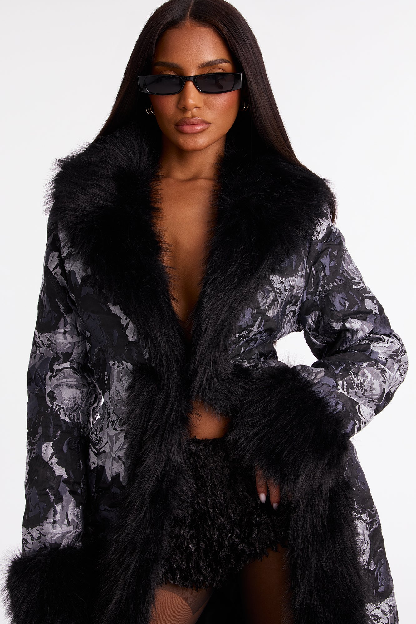 Becoming Richer Jacquard Fur Trim Coat - Black