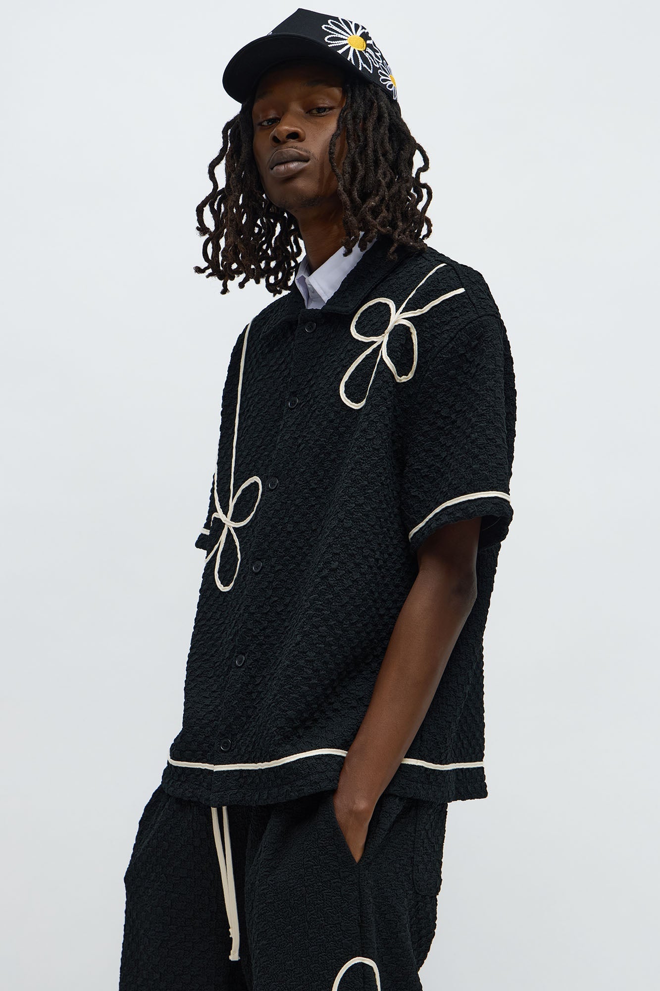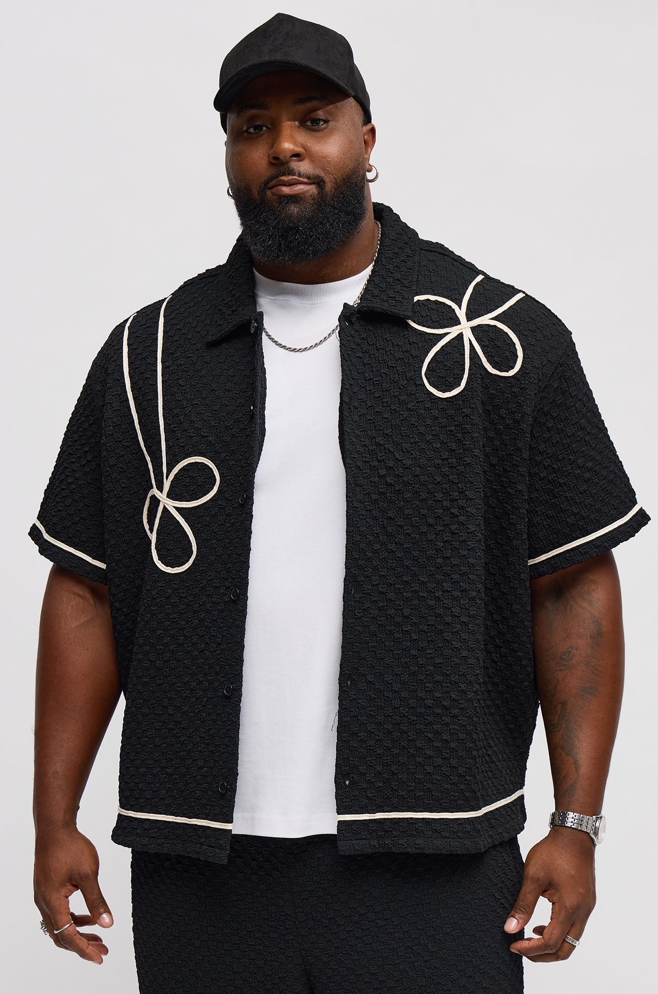 Boxy Soho Weave Applique Textured Button Up Shirt - Black