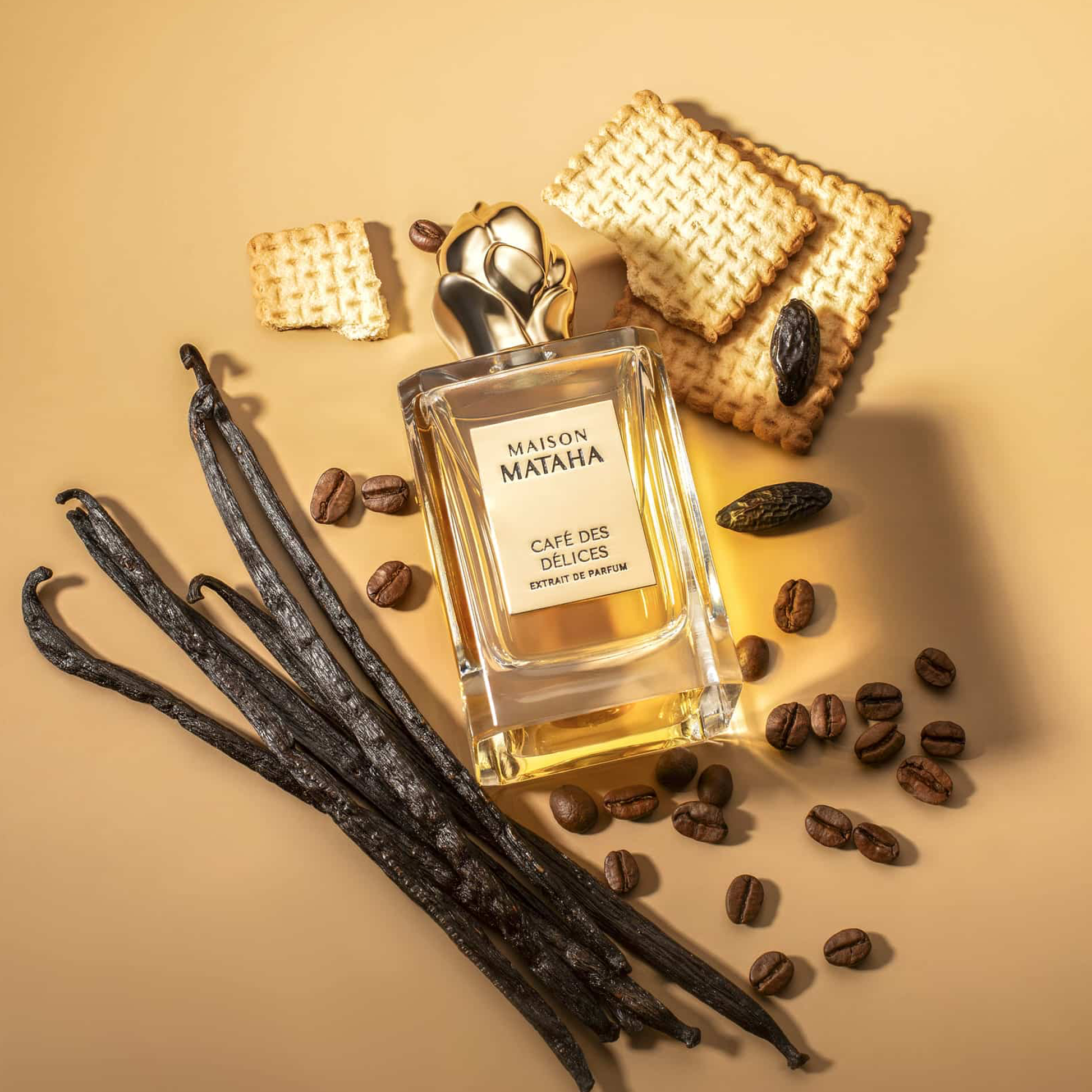 Café des Délices by Maison Mataha is a warm and comforting gourmand that captures the aroma of a morning coffee paired with sweet pastries. It opens with rich notes of café crème and golden biscuit, blending perfectly into a creamy heart of vanilla. The base introduces smooth tonka bean and soft musk, creating a delicate and enveloping finish that feels both cozy and refined.