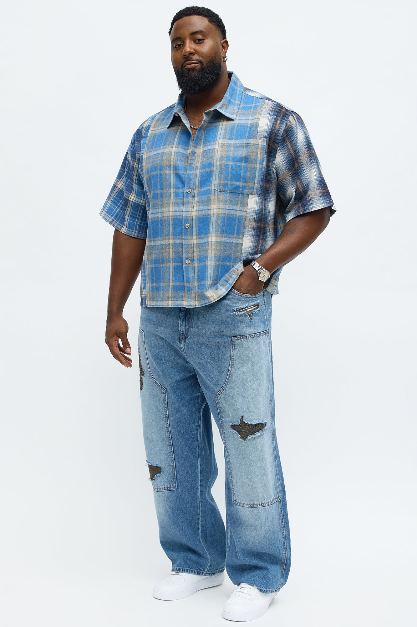 Cropped Patchwork Flannel Button Up - Blue/combo