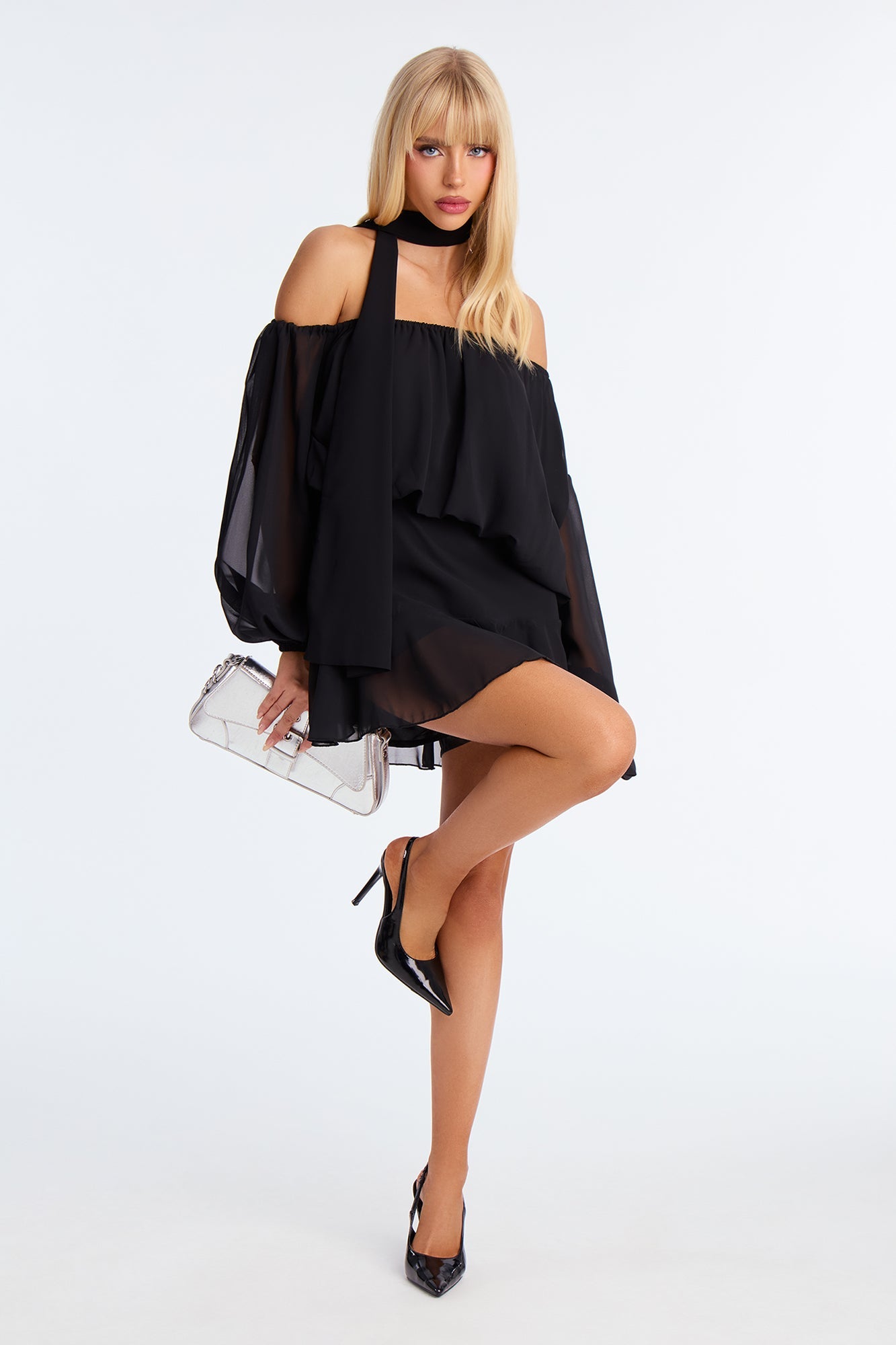 Fiona Chiffon Scarf Long Sleeve Romper - Black