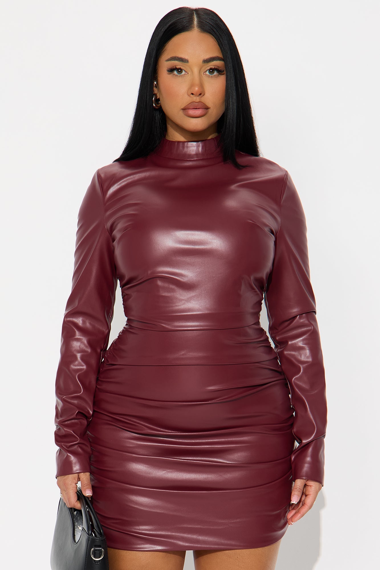 Kiara Ruched Faux Leather Mini Dress - Wine