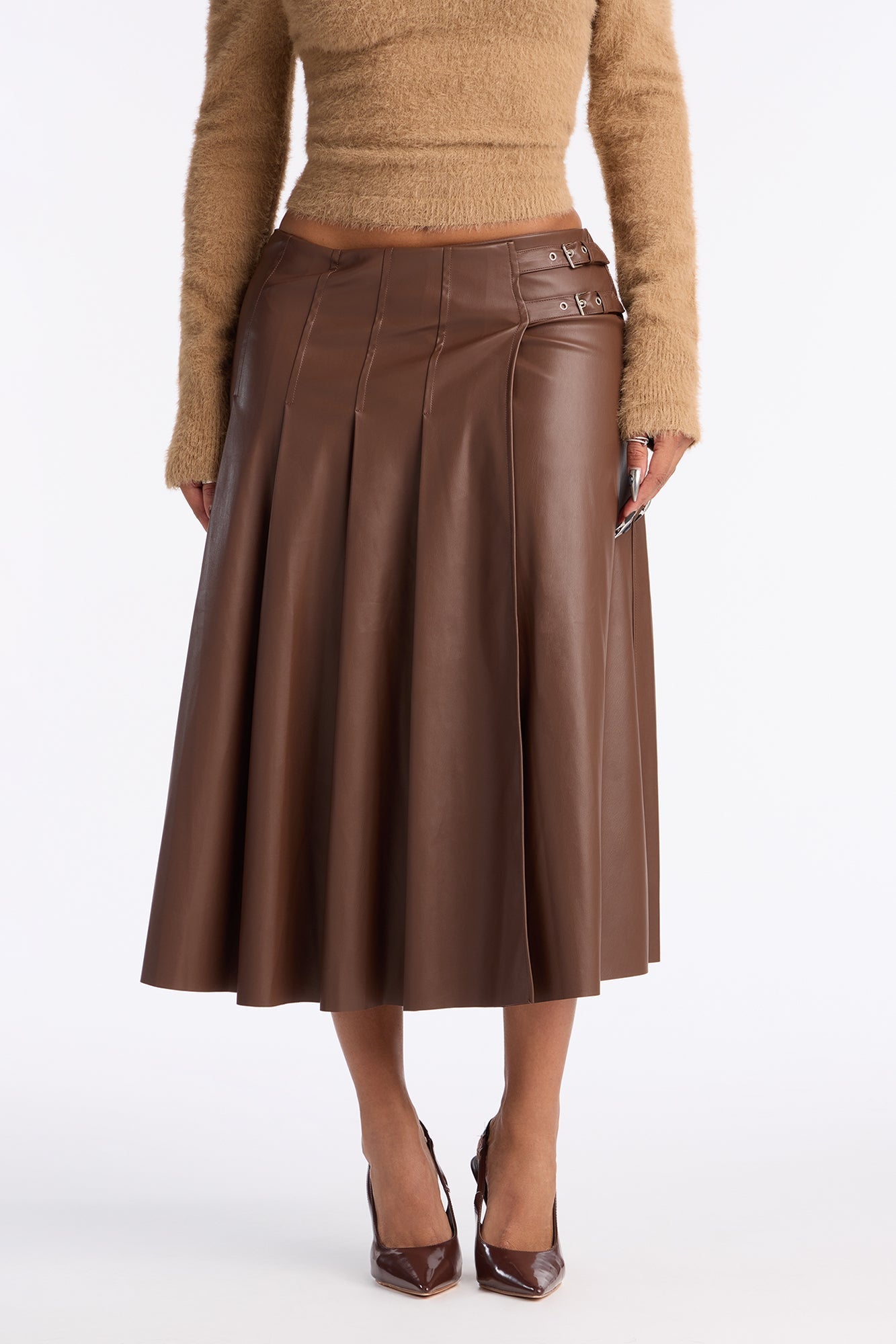 Kylie Belted Faux Leather Midi Skirt - Cognac