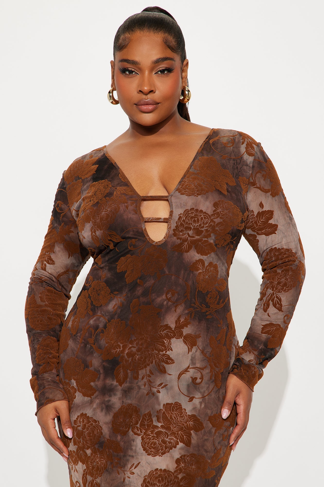 Let's Get Lost Flocked Floral Maxi Dress - Brown