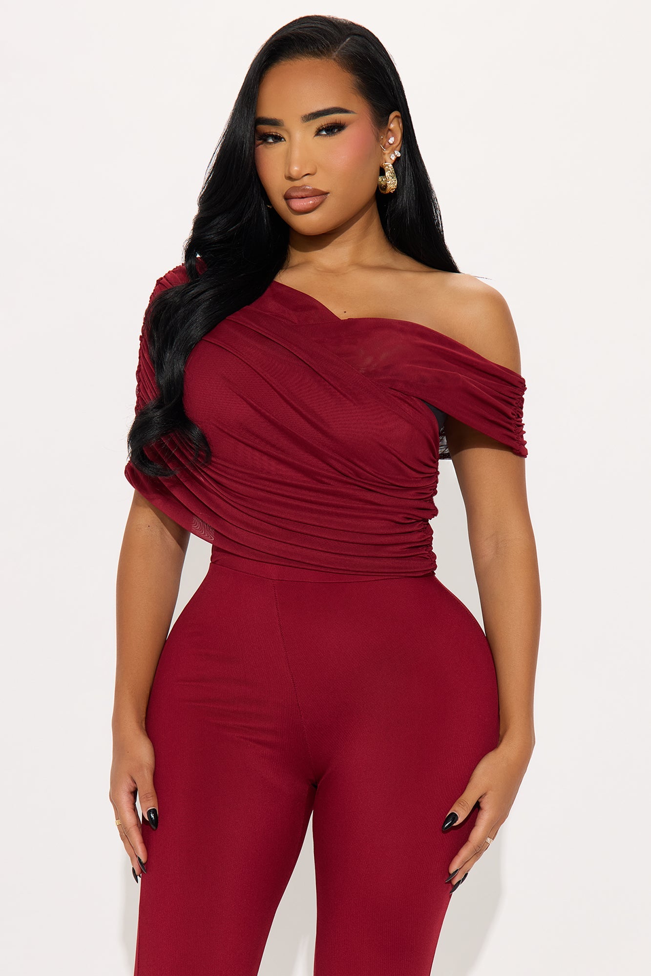 Lucy Ruched Mesh Off Shoulder Jumpsuit - Burgundy