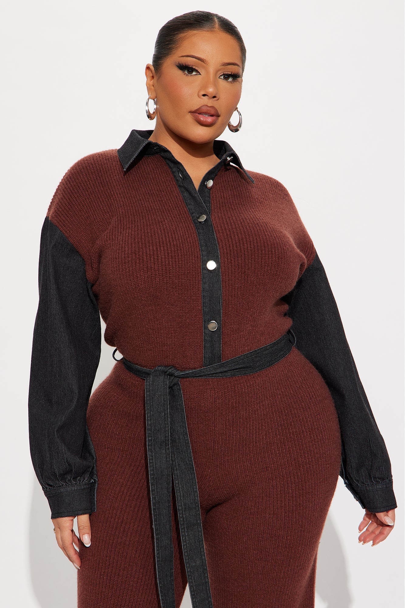 Maria Contrast Trim Collar Sweater Jumpsuit - Brown