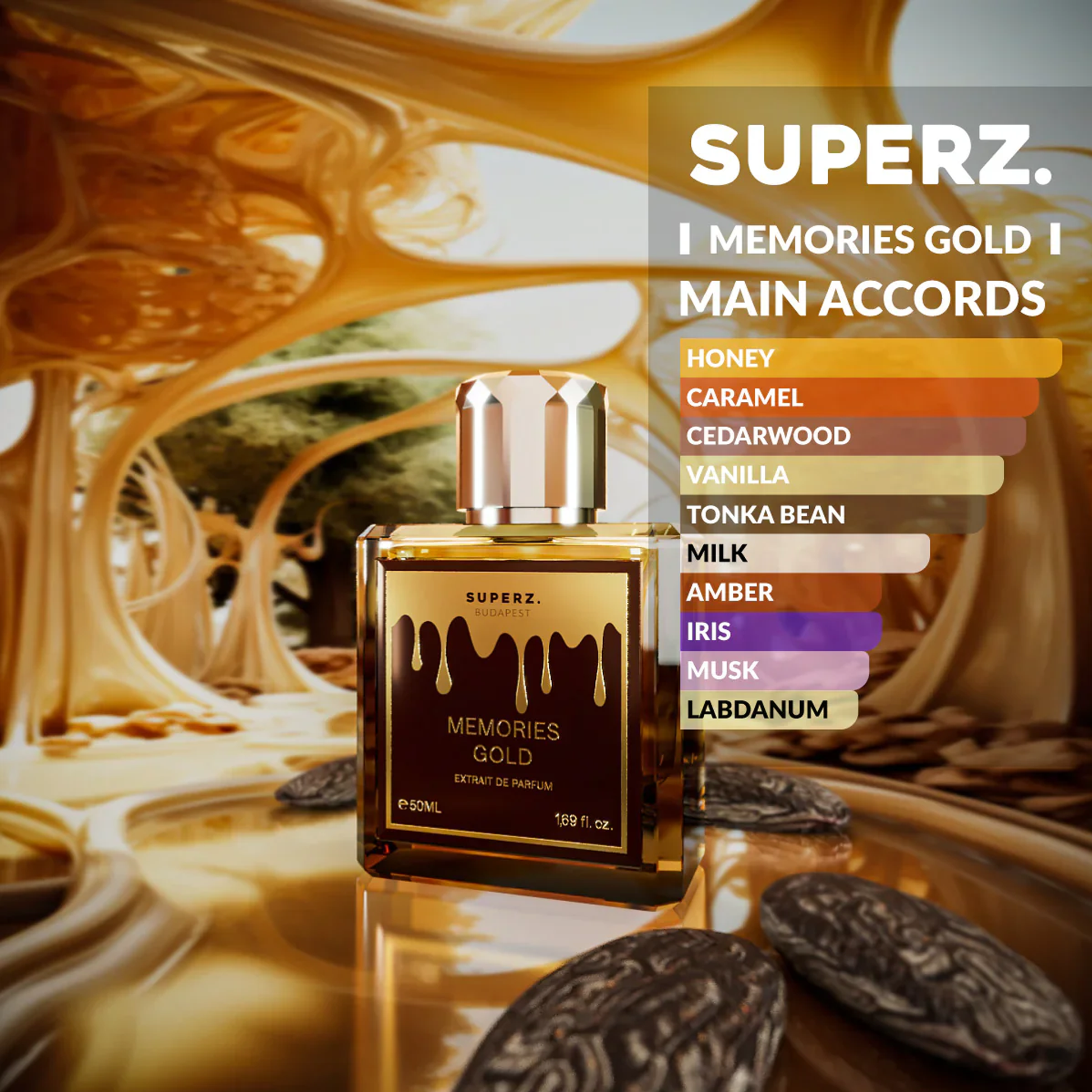 Memories Gold opens with a luscious mix of caramel and honey, delivering a sweet and indulgent start. The heart softens into a creamy blend of milk, vanilla, and iris, balanced by balsamic nuances. In the base, tonka bean and amber join with cedarwood and musk to create a warm, sensual finish.