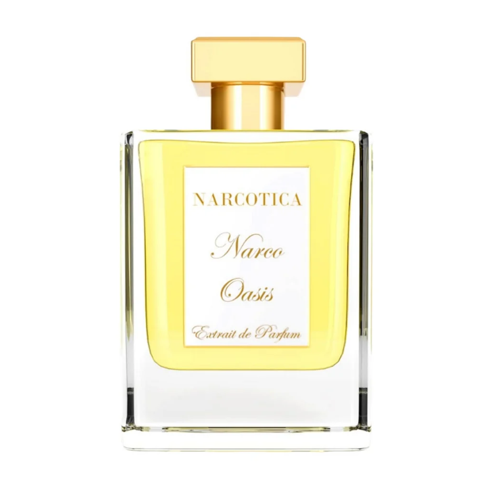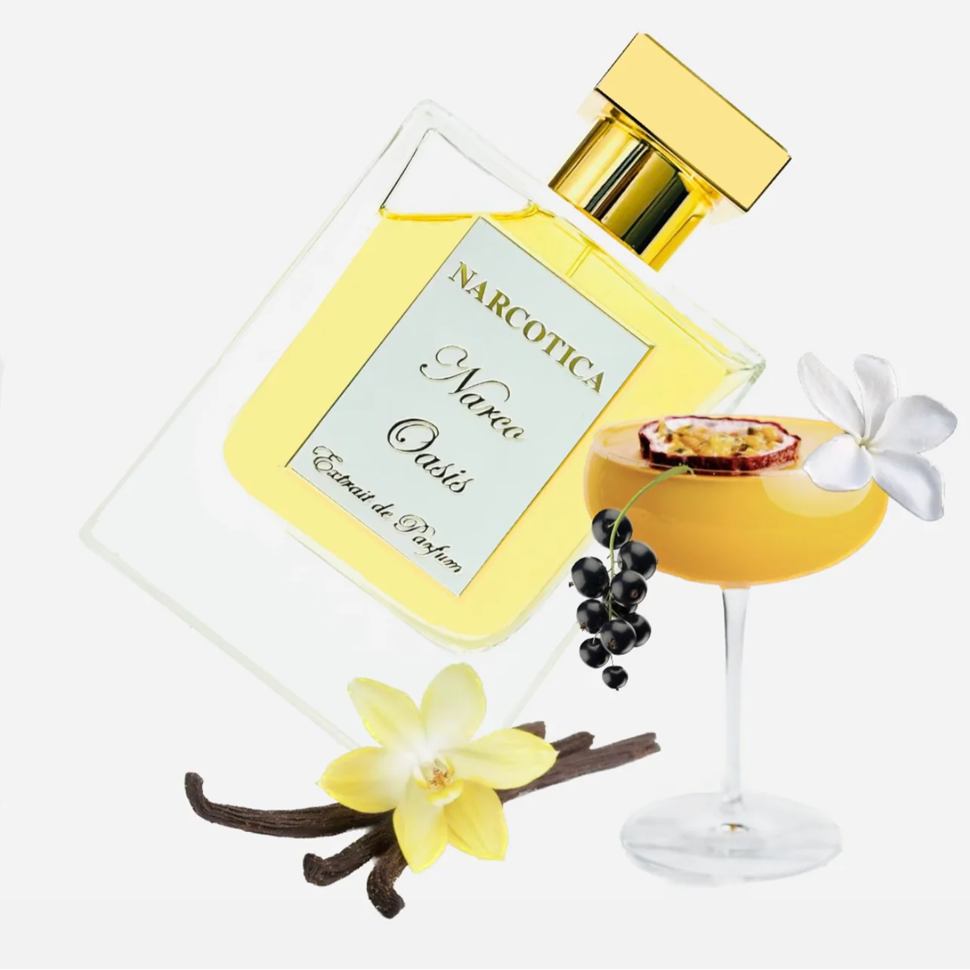 Narco Oasis opens with tropical passionfruit, blood orange, and black currant. The heart reveals peach, pear, jasmine, iris, brown sugar, tonka, and vanilla. A rich base of blonde woods, sandalwood, musk, vanilla bean, and sea amber creates a sun-warmed, creamy finish.