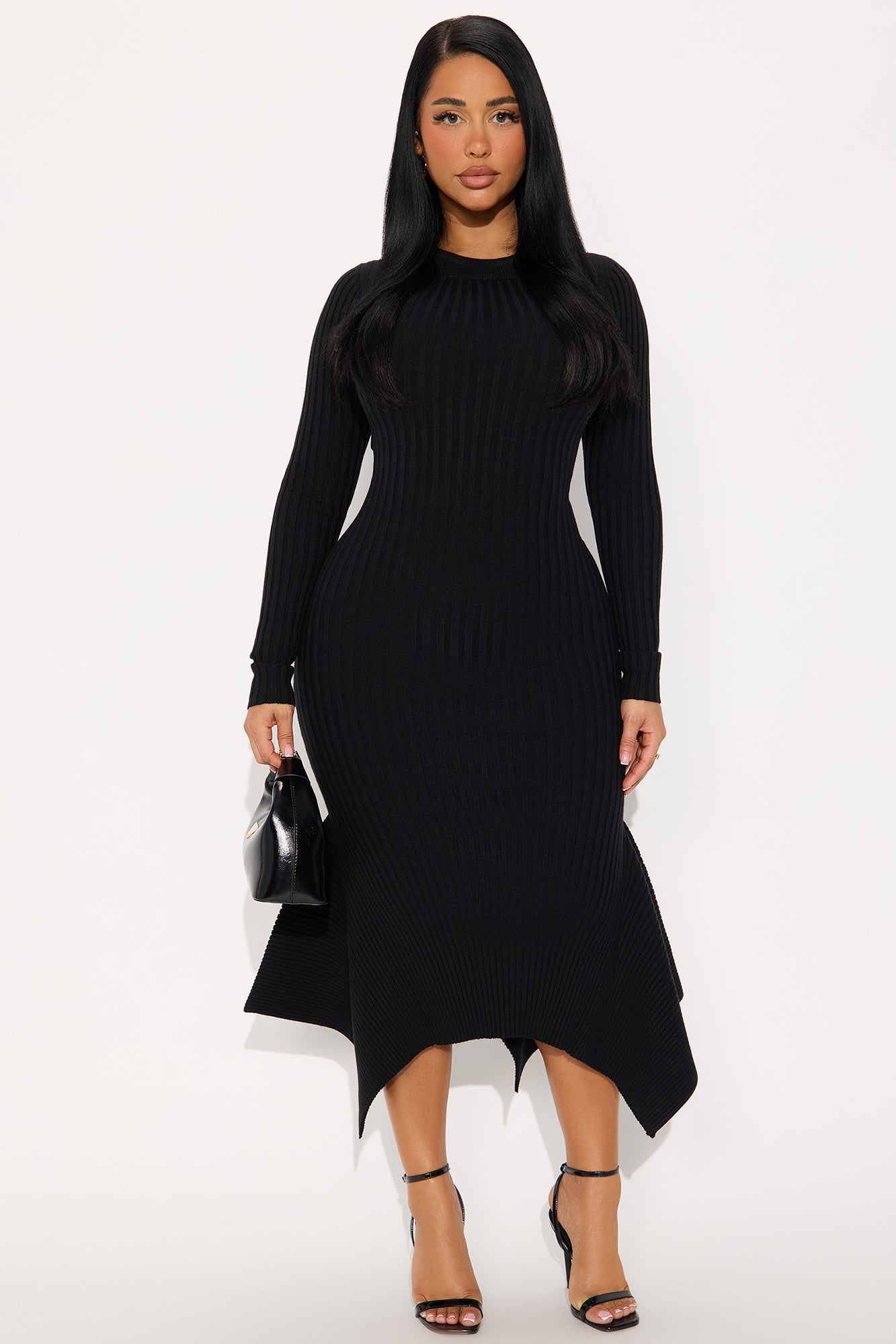 Rare Catch Long Sleeve Ribbed Midi Dress - Black