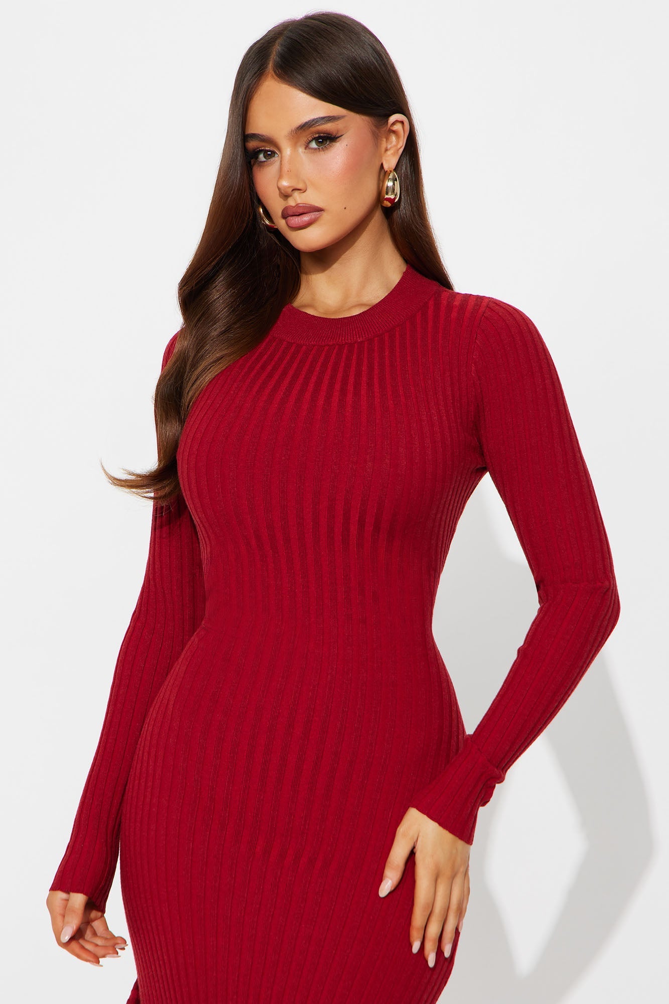 Rare Catch Long Sleeve Ribbed Midi Dress - Wine