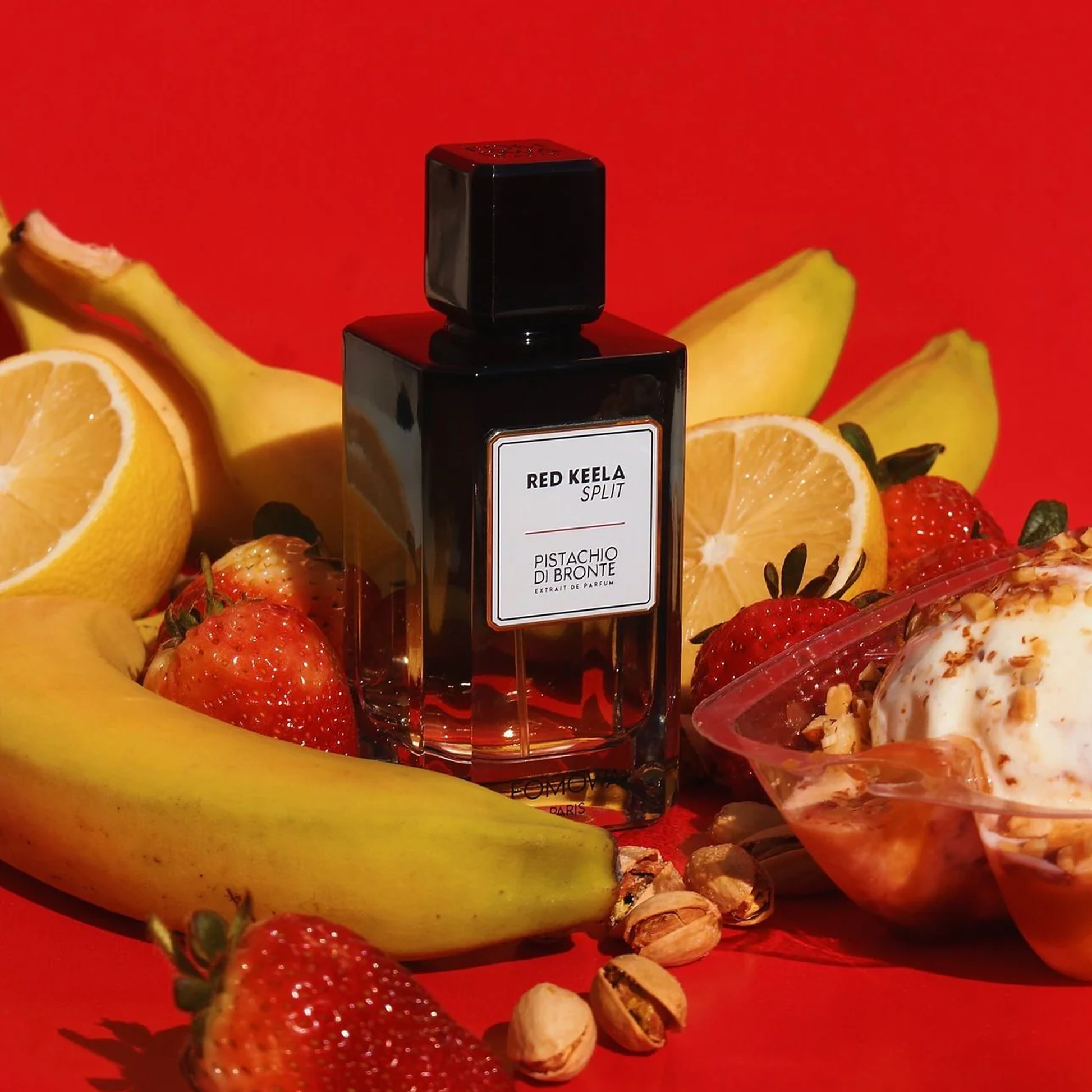 Red Keela Split opens with zesty Italian lemon that quickly melts into a heart of banana sorbet, strawberry gelato, and orange blossom. The base reveals layers of Sicilian pistachio cream, caramel whipped cream, vanilla, tonka bean, ambroxan, and sandalwood, forming a decadent gourmand that feels both playful and luxurious.
