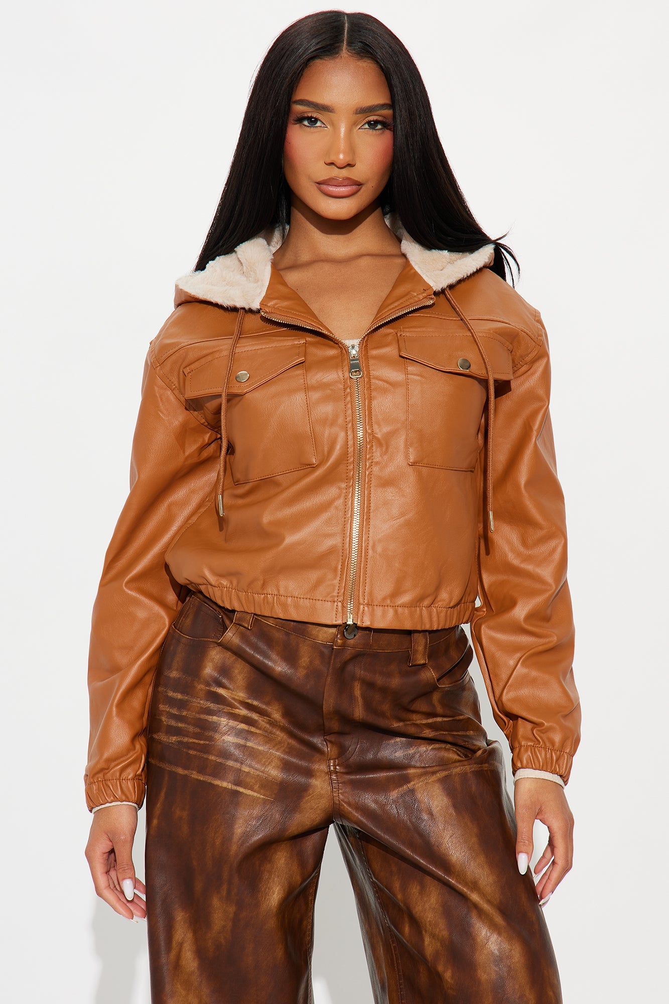 Sammie Fur Hood Faux Leather Jacket - Cognac