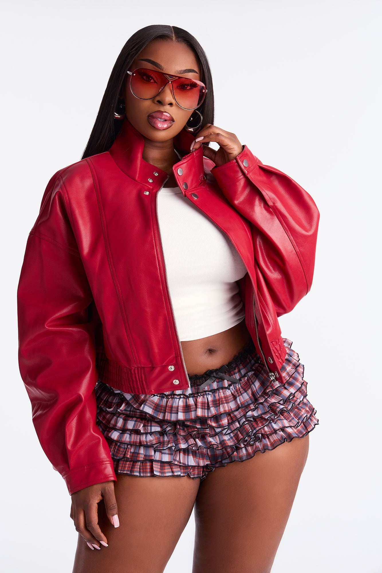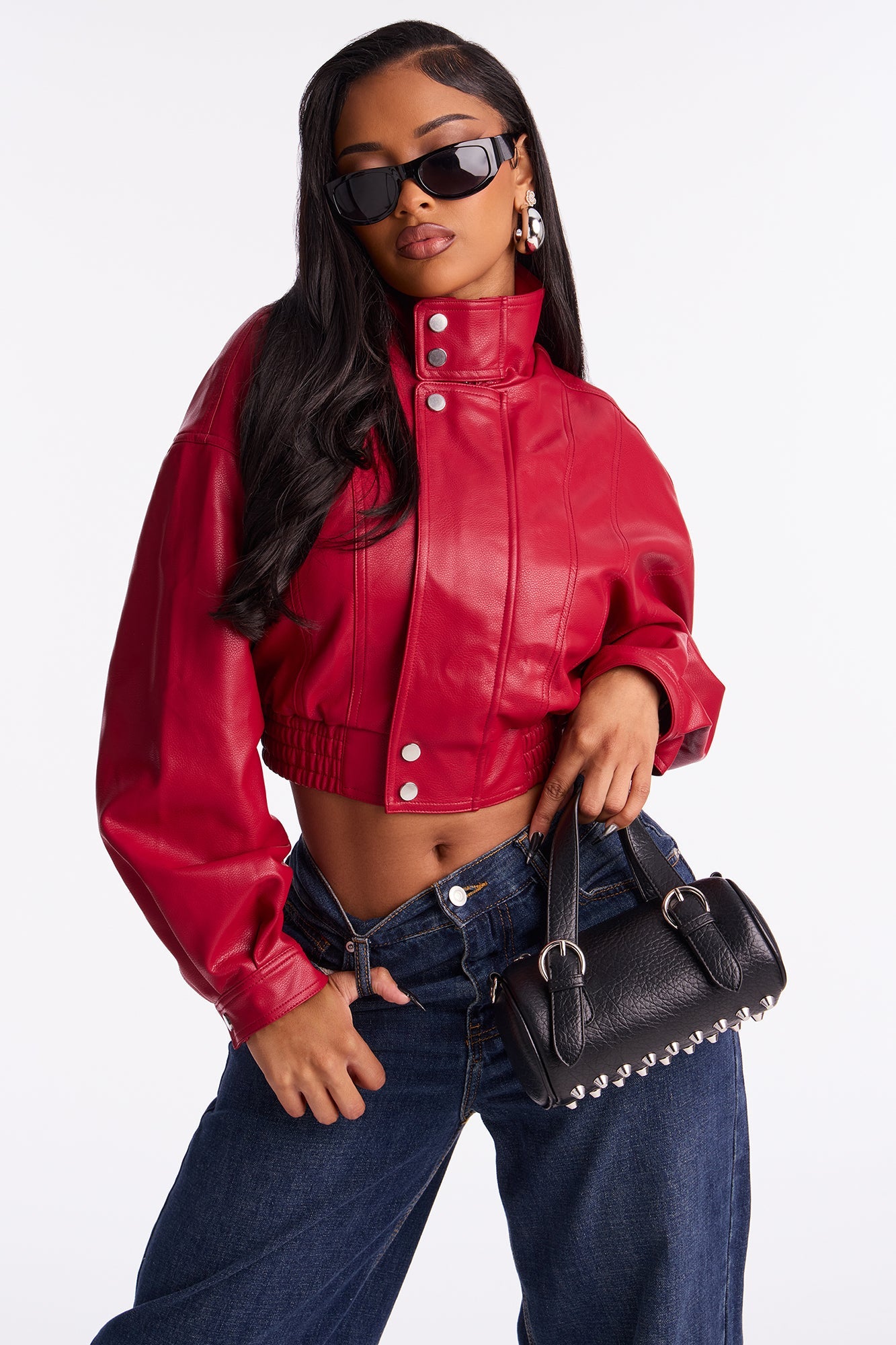 Show Stopper Cropped Faux Leather Bomber Jacket - DarkRed