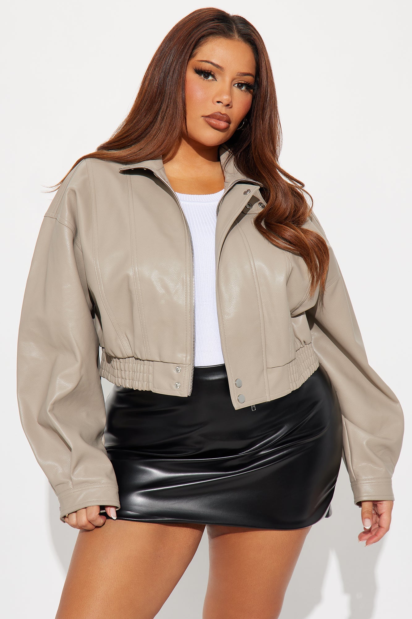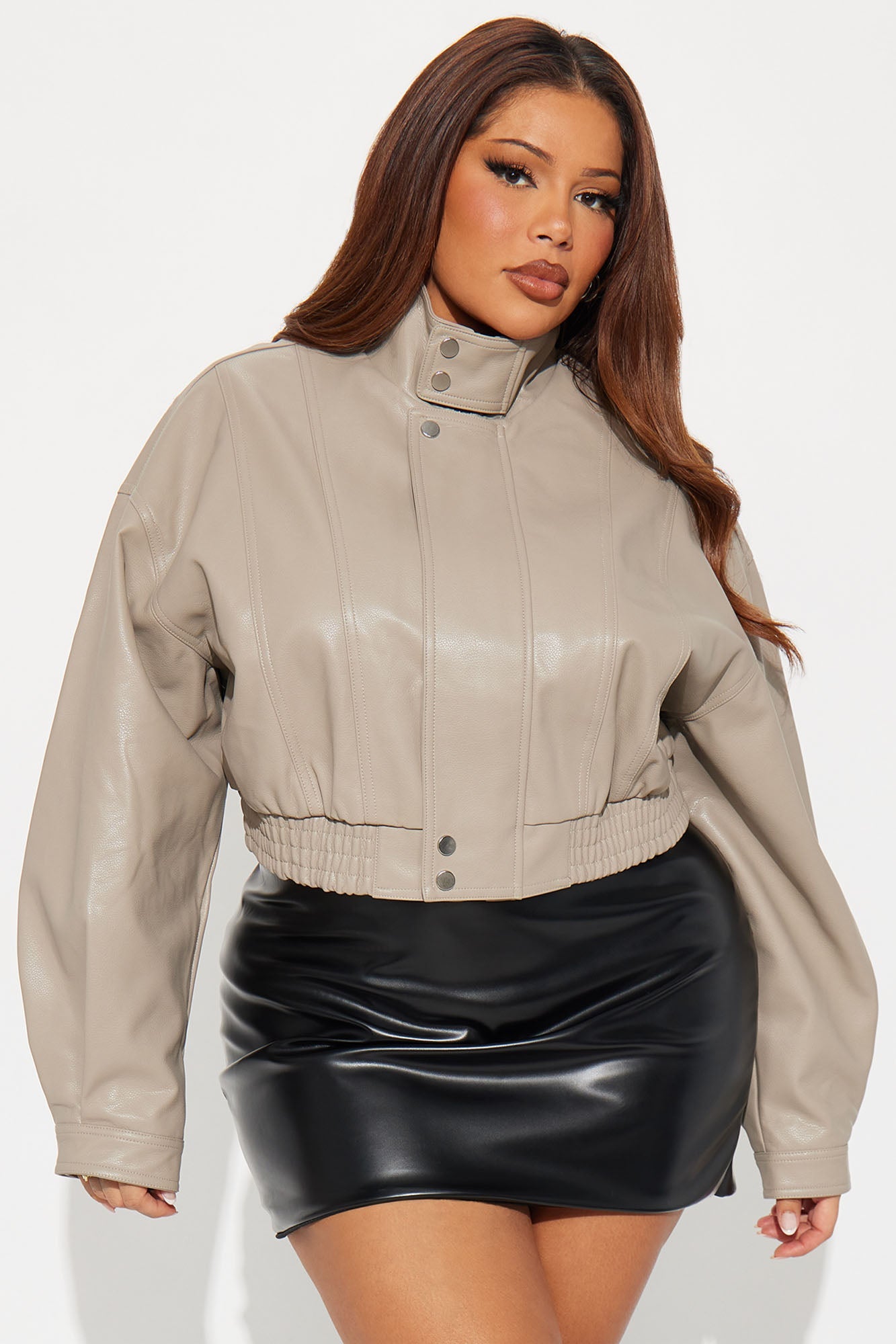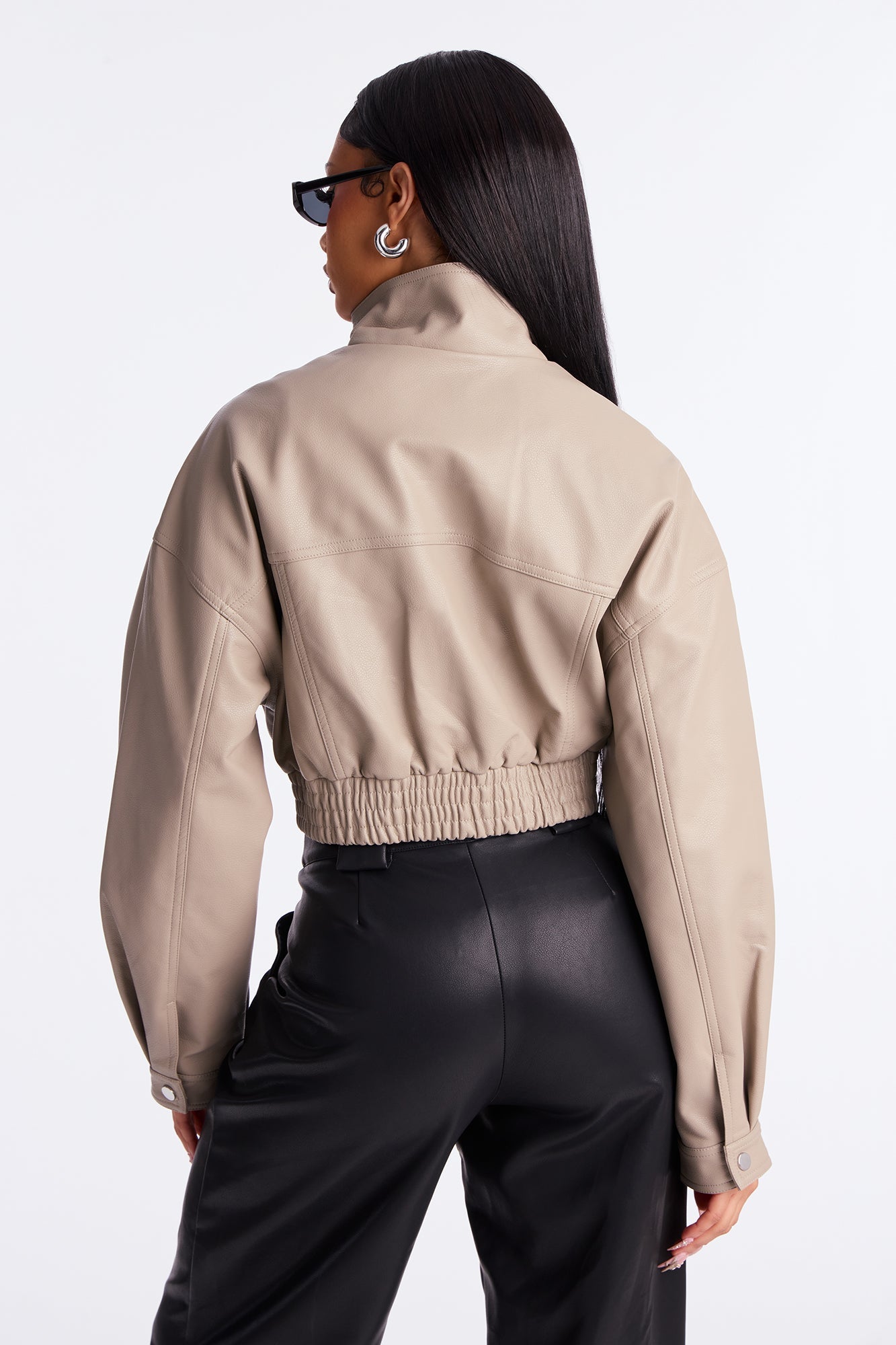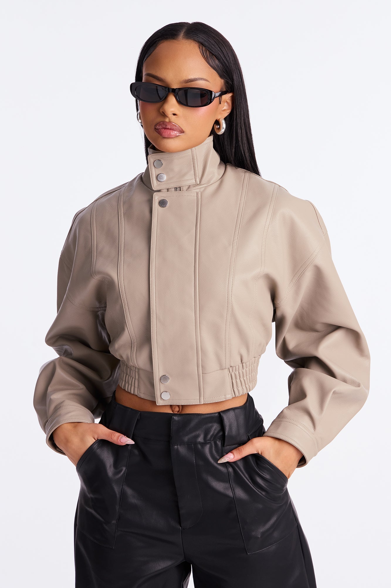 Show Stopper Cropped Faux Leather Bomber Jacket - Taupe