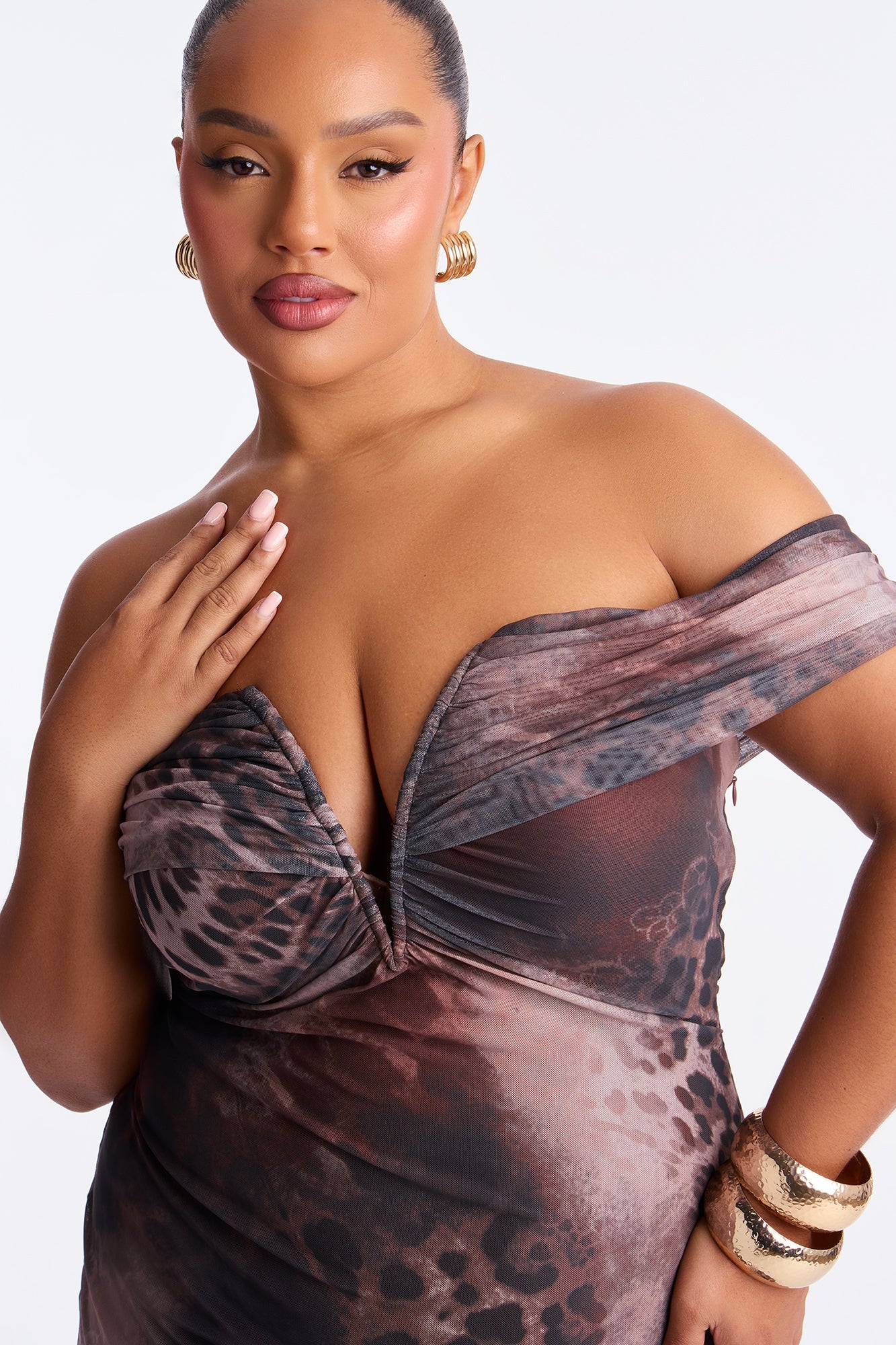 Soraya Off Shoulder Mesh Midi Dress - Brown/combo