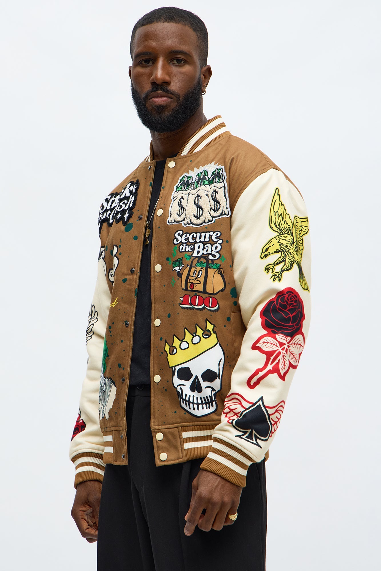 Stack The Cash Varsity Jacket - Brown