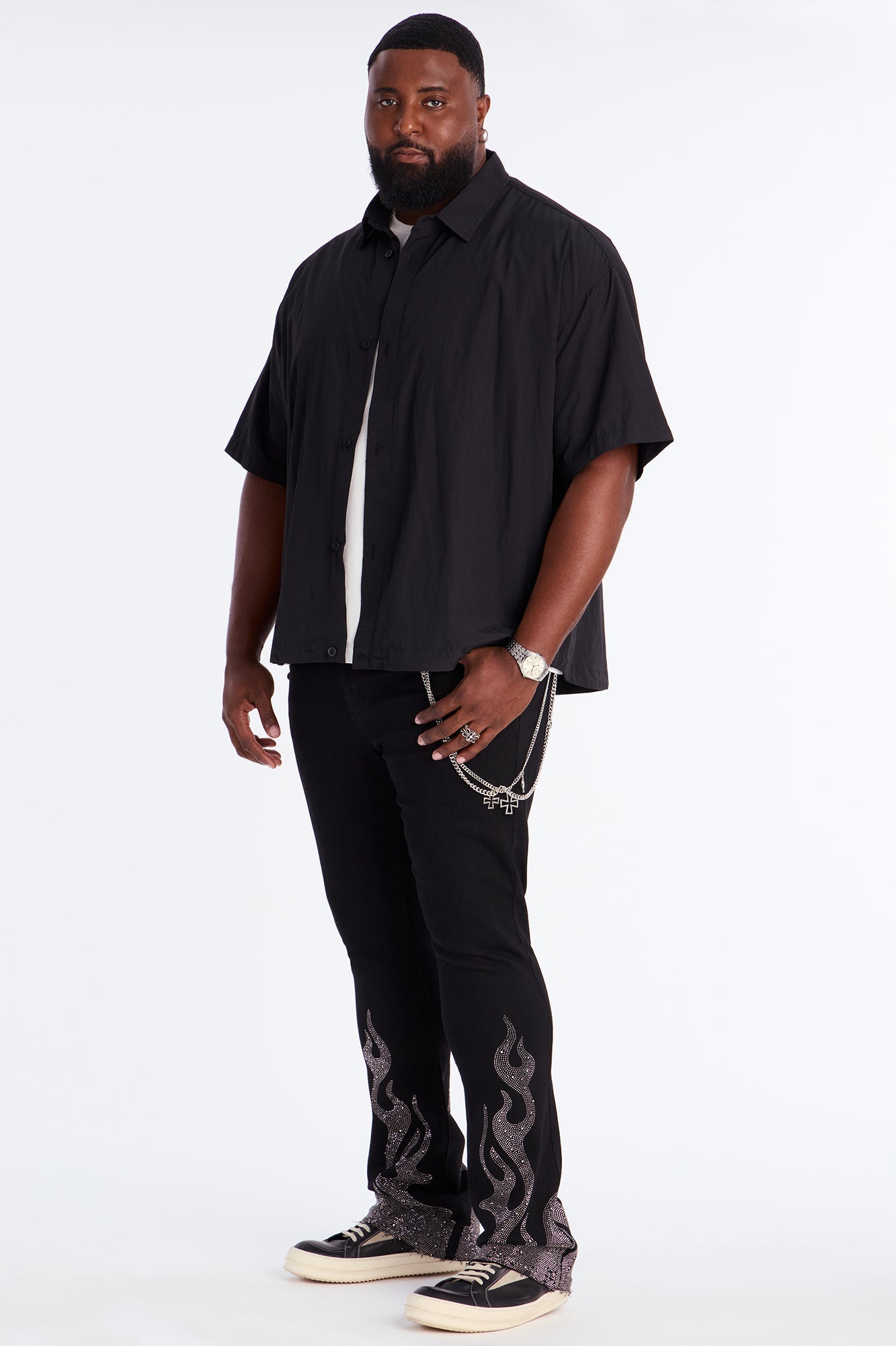 Stacked Skinny Flare Flames Up Jeweled Jean - Black