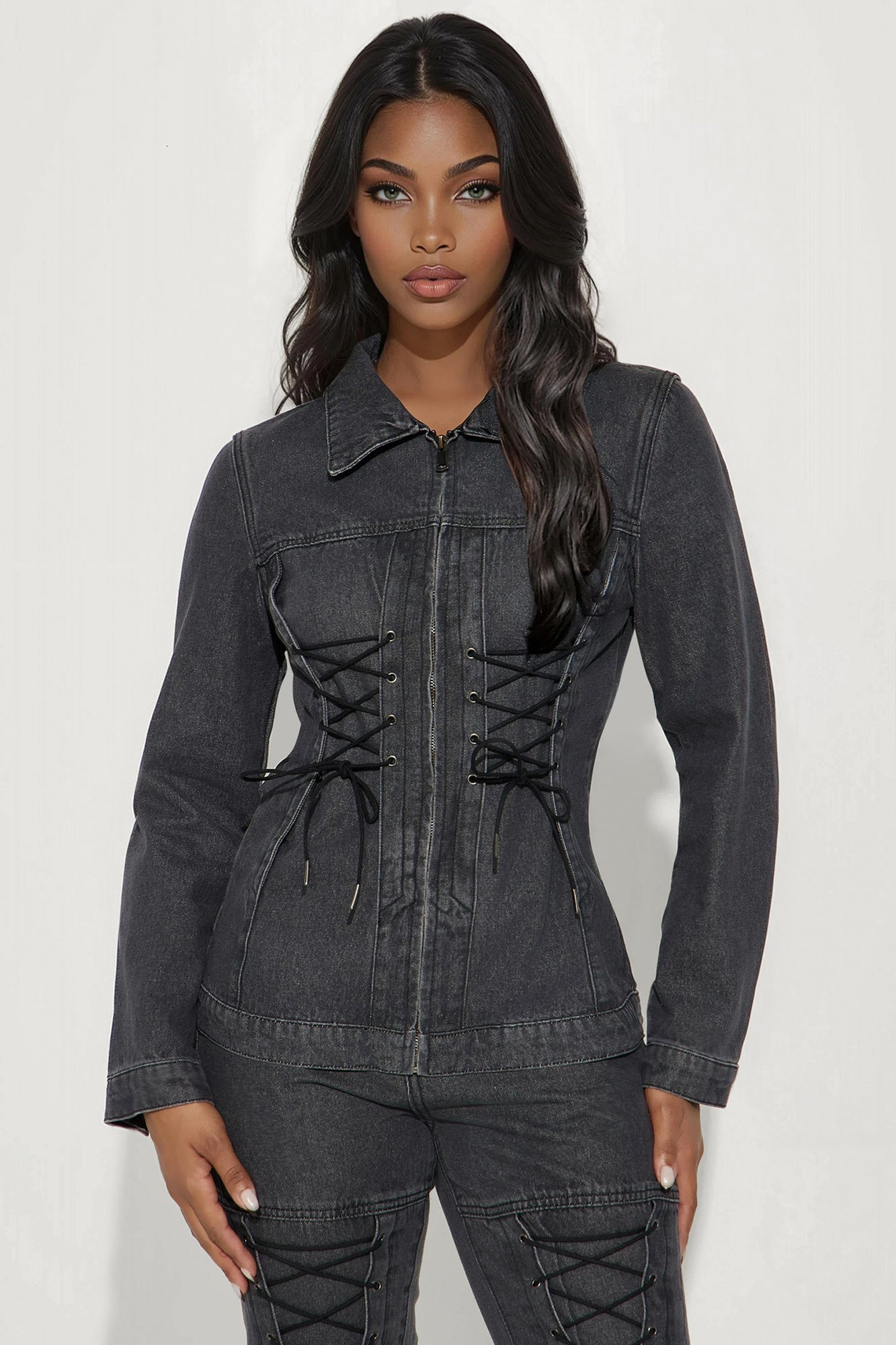 Tied Together Lace Up Denim Jacket - Dark Grey