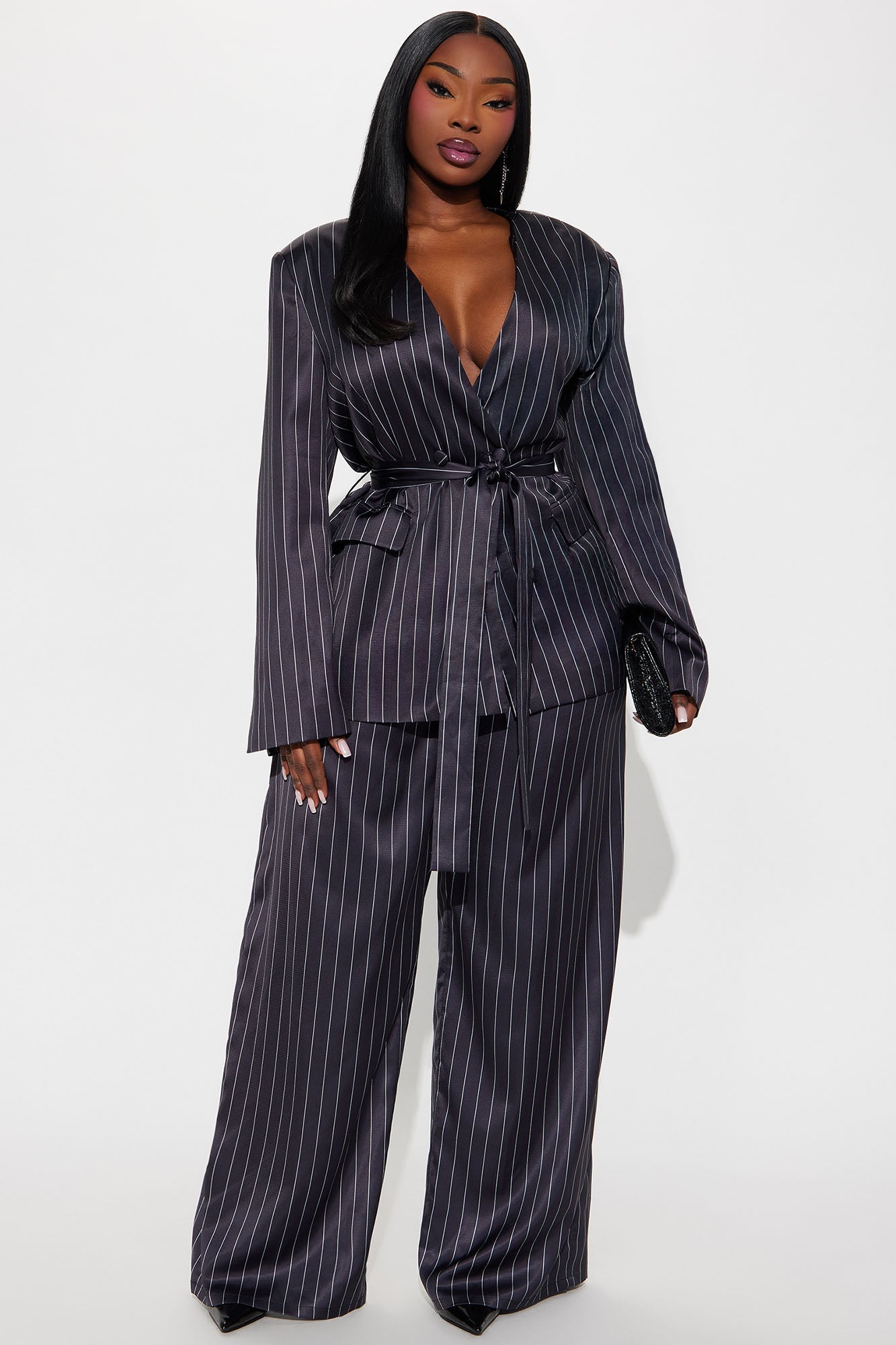 To Be Precise Pinstripe Satin Belted Blazer Pant Set - Black