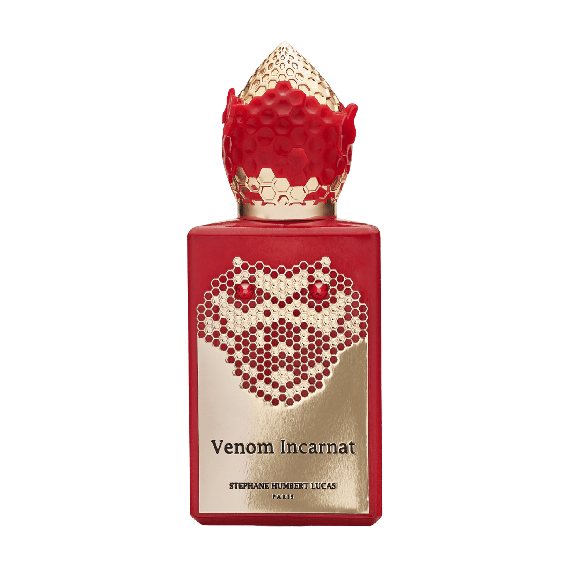 Venom Incarnat by Stéphane Humbert Lucas 777 is a darkly seductive gourmand-leather fragrance that balances sweetness with intensity. It opens with juicy red fruits—wild strawberry, caramelized strawberry, and blackberry—wrapped in a decadent sweetness. The heart reveals raspberry, Virginia cedar, and cinnamon, adding warmth and sensual contrast. The base settles into Russian leather, tonka bean, vanilla, patchouli, and balsam fir, creating a smoky, resinous depth that lingers with luxurious allure.
